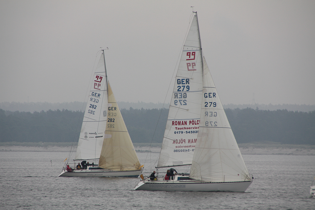 Am Freitag abend führte der Kurs bis nach Lubmin, aber selbst diese kurze Strecke musste aufgrund des flauen Windes an der Bohrplattform vor Gahlkow abgekürzt werden. Trotzdem war es ein spannendes Rennen, bei dem wir nach dem Start noch hinter unseren zwei Schwesterschiffen lagen, beide aber vor dem Ziel wieder einholen konnten. Das Ergebnis war ein 3. Platz in der Yardstickgruppe 1.