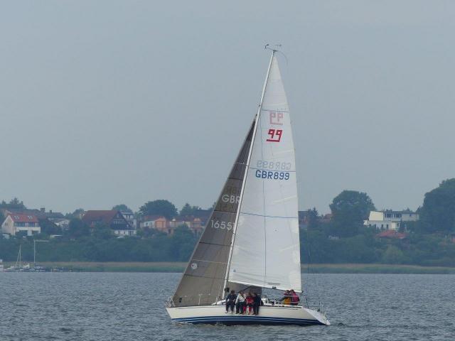 Der Kurs führte rechts um Hiddensee herum, so dass wir zunächst durch die Vierendehl-Rinne und den Gellen-Strom auf die Ostsee segelten. Kurz vor der ersten Bahnmarke, der Tonne 45 am Eingang der Vierendehl-Rinne, hatte Heiko an der Pinne uns (Micha, Annett, David, Rolf und Stefan) dann in die Führung gebracht. In der engen Rinne erwischte uns vor Barhöft eine Wetterfront, die Starkregen und Windböen über 20kn brachte. Fast im Blindflug wechselten wir die große Genua gegen die Fock, mussten aber eine Viertelstunde später wieder zurückwechseln, als die Front durch war und sich der Wind wieder normalisierte. Dank Rolf auf dem Vorschiff lief das aber in Rekordzeit 😉 Danach ging es am Wind die Außenküste von Hiddensee entlang bis zum Dornbusch, dabei immer dicht verfolgt von der X-99 Matchbox, und dann mit Spinnaker im Hiddensee-Fahrwasser wieder zurück nach Stralsund. Das Ziel passierten wir um 15:40 Uhr nach 6 Stunden, 40 Minuten gesegelter Zeit als erstes Schiff. Über diesen Sieg bei Rund Hiddensee (1. Platz Klassenwertung, Pokal schnellste gesegelte Zeit, Pokal schnellste gerechnete Zeit) haben wir uns nach dem Sieg bei Rund Rügen im letzten Jahr sehr gefreut 😉 Hier die Ergebnisse.
