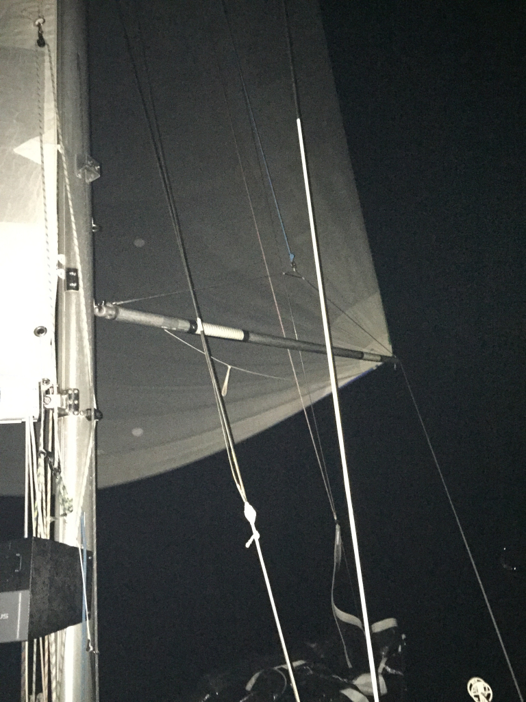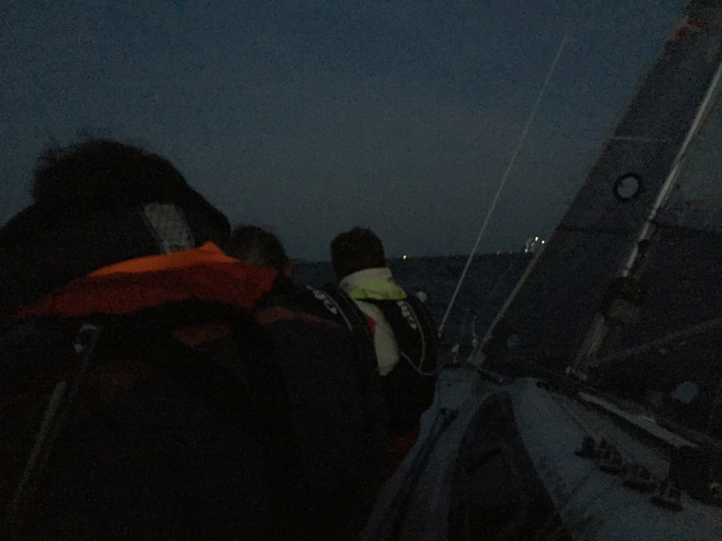 Nach der Tonnenrundung geht es, jetzt im Dunkeln, wieder mit einem Schrickkurs zurück zum Landtief. Auf diesen Straßenbahn-Kursen sind die größeren Boote leider nicht zu halten. Erst nachdem wir wieder im Bodden sind und Richtung der nächsten Bahnmarke Tonne Reddevitz laufen, kann der Spinnaker hochgehen.