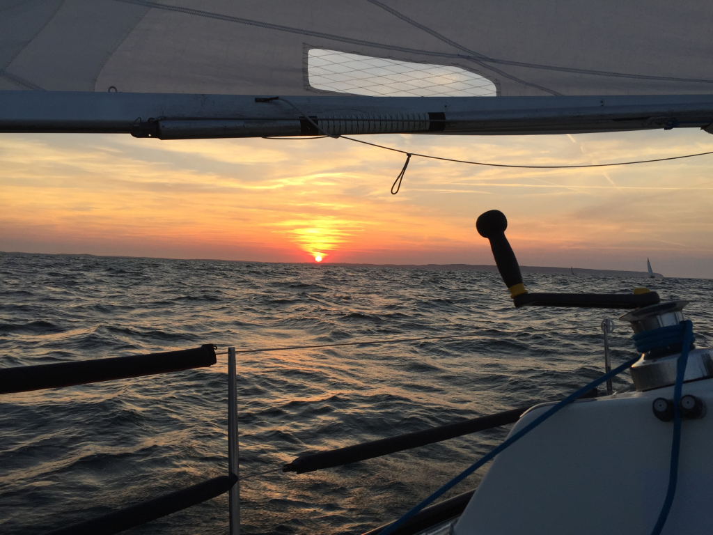 Auf dem Weg nach Norden produziert der Sonnenuntergang glutrotes Licht. Kurz vor Tonne Sassnitz lässt der Wind leicht nach, wir wechseln von der Fock auf die große Genua.