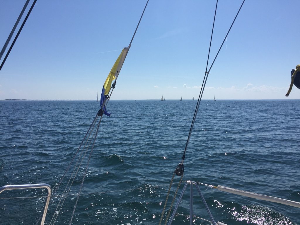 Am Sonnabend früh geht’s dann bei Karibikwetter auf zur Langstrecke Rund Hiddensee. Angesagt sind leichte östliche Winde, und das mit dem „leicht“ stimmt sehr genau… Zum Start der 69 Schiffe (darunter vier X-99: Matchbox, Hoppetosse, Drei auf X und Swash Buckler) um 09.10 Uhr wehen noch etwa 6 Knoten Wind. Wir (Heiko, Rolf und Gunther an der Pinne, Katy, Micha und Ralf) erwischen den Start passgenau und kommen als erstes Boot der Klasse an der Luvtonne an.