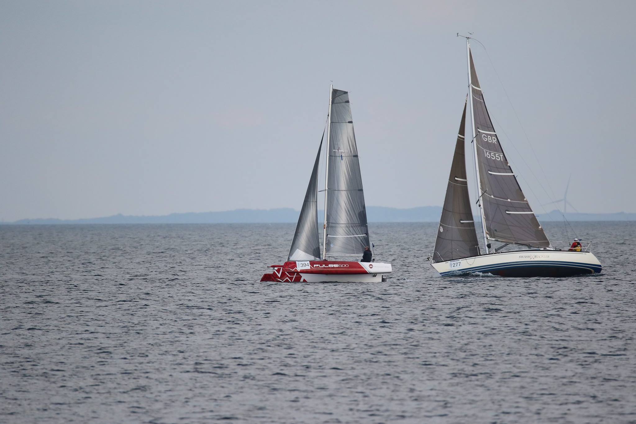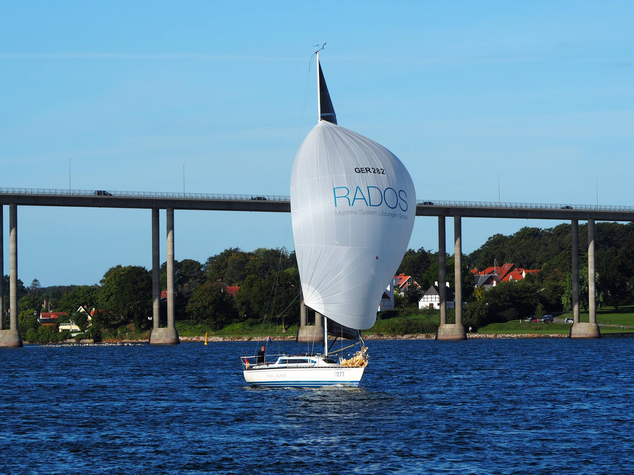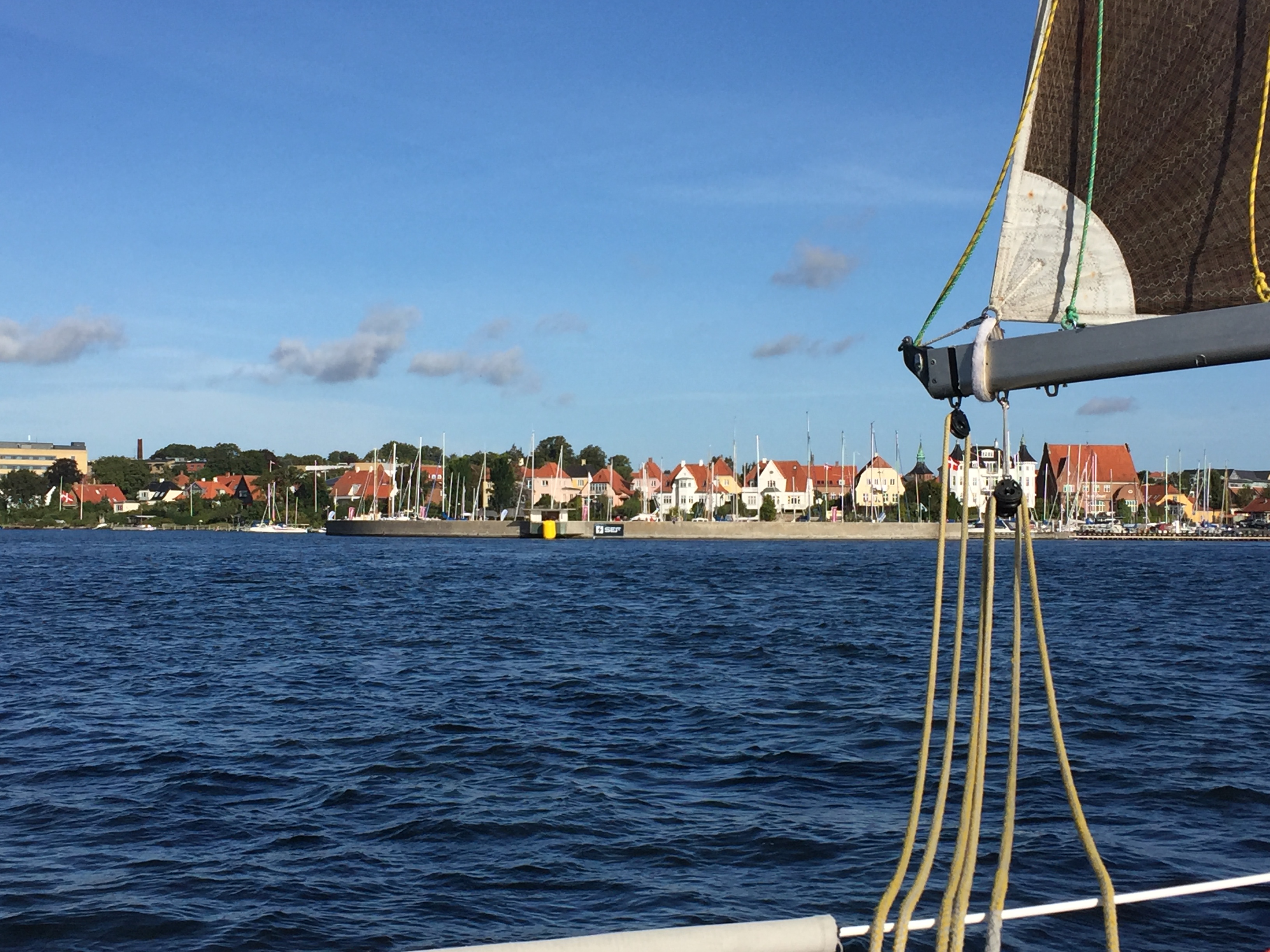 Die Brücke passieren wir gegen 13:45 Uhr. Nyx und Bluenose knapp voraus, Livet dicht hinter mir. Ich muss daran denken, wie ich genau an dieser Stelle vor zwei Jahren mangels Wind aufgegeben habe – damals ging es rechts um Fyn herum, und von hier waren es nur noch 20 Meilen bis ins Ziel. Nun rauschen wir hier mit knapp 8 Knoten Fahrt entlang… Ab hier folgt ein Am-Wind Schlag bis zur Passage zwischen Fyn und Romsø. Als wir Romsø erreichen, habe ich mich gerade so an Bluenose vorbei geschoben, Livet sitzt mir nach wie vor im Nacken.