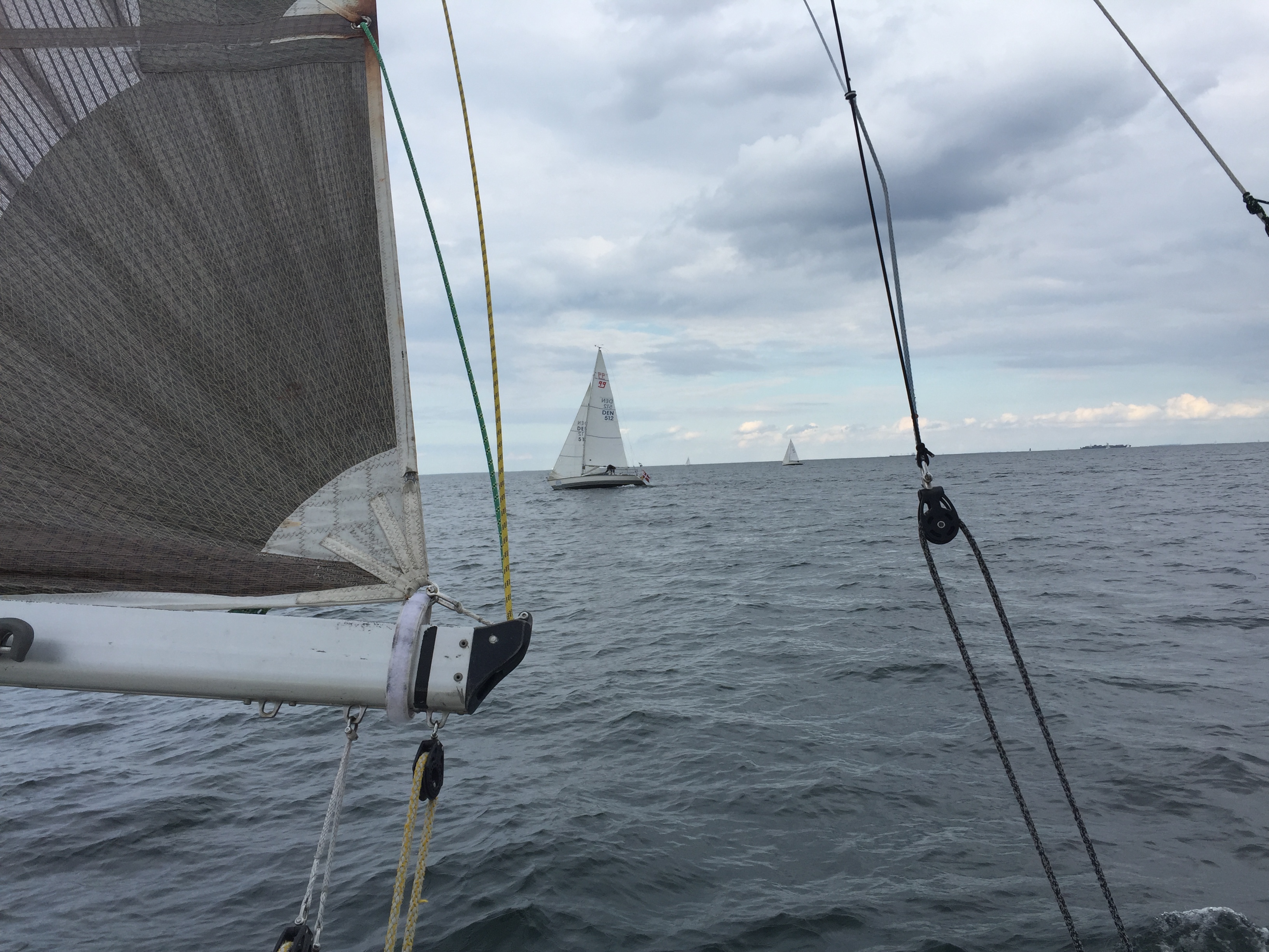 Gestartet wird diesmal nach Osten, Fyn bleibt an Backbord. Der Strom setzt ebenfalls nach Osten, wir müssen aufpassen, nicht schon vor dem Startsignal über die Linie zu treiben. Ich positioniere mich direkt neben der Nyx an der Steuerbordseite der Linie, und komme ganz gut los.