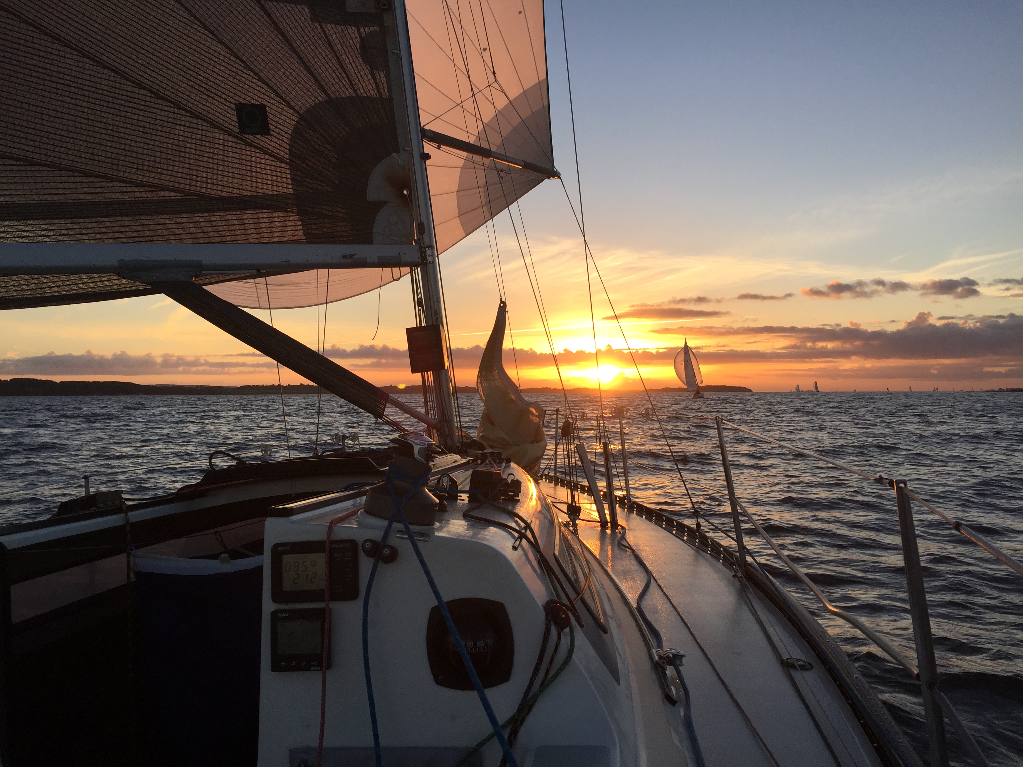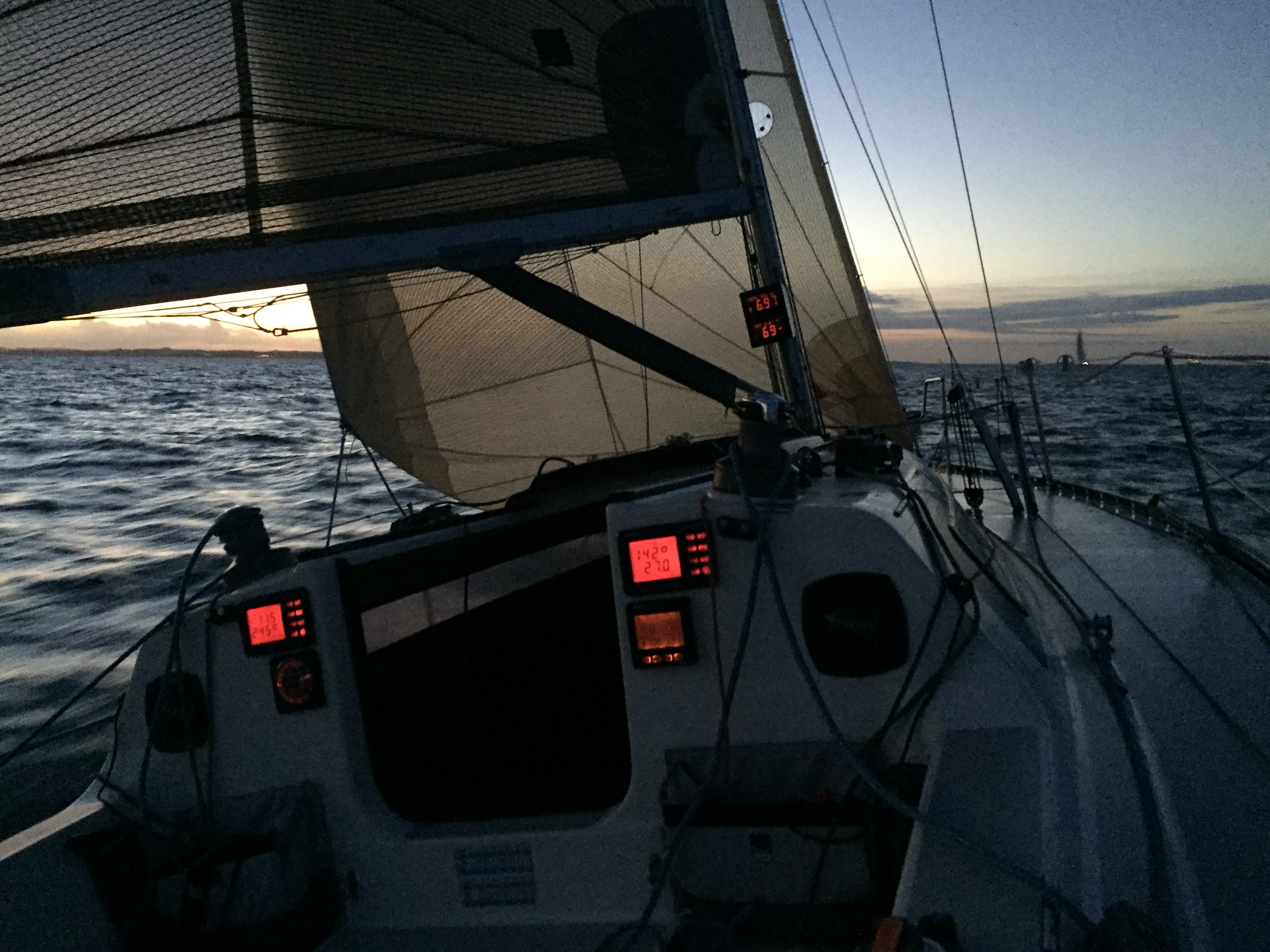 Erst gegen 03:00 Uhr haben wir die Engstelle passiert, sind im Kleinen Belt und haben wieder freien Wind. Ich bin wieder knapp vor Bluenose, und jetzt geht es mit einem Anlieger und leicht geöffneten Segeln Richtung Süden. Bei Bågø hat sich Bluenose wieder irgendwie vorbei gearbeitet, auch die X-99 Zuxu hat uns beide passiert. Das sehe ich allerdings erst nach dem Rennen, als ich mir das Replay des GPS-Trackers anschaue. Bis Lyø geht es jetzt mit offenen Segeln und 10-12 Knoten Südwestwind immer nur geradeaus. Steuern, trimmen, steuern, trimmen. Dazu kommt jetzt die Müdigkeit, die sich aber mit einem starken Kaffee und Traubenzucker schnell wieder vertreiben lässt. Gegen 06:30 Uhr am Samstag früh setzt langsam die Dämmerung ein, und als gegen 07:00 Uhr Lyø erreicht ist und der Spinnaker wieder oben ist, geht die Sonne genau vor dem Bug auf – eine herrliche Atmosphäre.