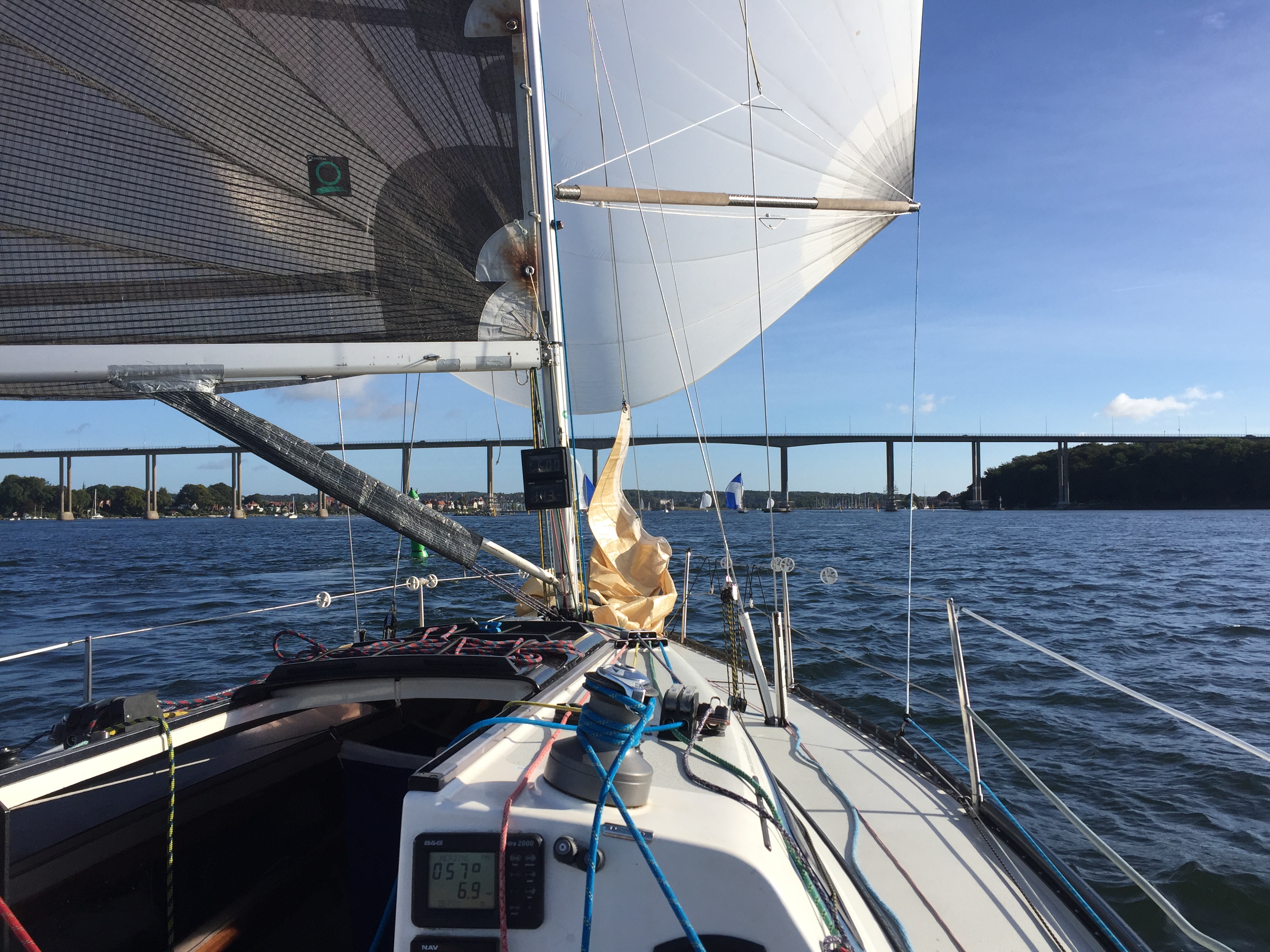 Am Ausgang des Svendborgsunds geht dann der Spi hoch. Damit bin ich so beschäftigt, dass ich erst zu spät merke, dass Livet auf der Leeseite neben mir etwas höher fährt. Es gibt einen leichten Kontakt – nochmal sorry, Jan! Nach einer Halse geht es zwischen Fyn und Langeland nordwärts Richtung Große Belt-Brücke. Mit Schiebestrom von hinten läuft Swash Buckler konstant 7-8 Knoten.