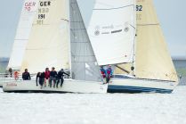 Sonnabend früh um 09:05 Uhr werden wir dann in Yardstickklasse 1 mit dem letzten Start auf den Weg um die Insel geschickt, dieses Jahr links herum. Mit dabei sind auch in diesem Jahr mit Matchbox und Drei auf X zwei Schwesterschiffe. Nach einer kurzen Startkreuz kommen wir (Heiko und Gunthi an der Pinne, Micha, Stefan, Rolf und Ralf) als zweites Schiff kurz nach der Melges 24 Laika an der Luvtonne an. Ab hier geht es bei Sonne und 3-4 Windstärken mit Halbwind zwischen Rügen und Hiddensee hoch nach Norden.
