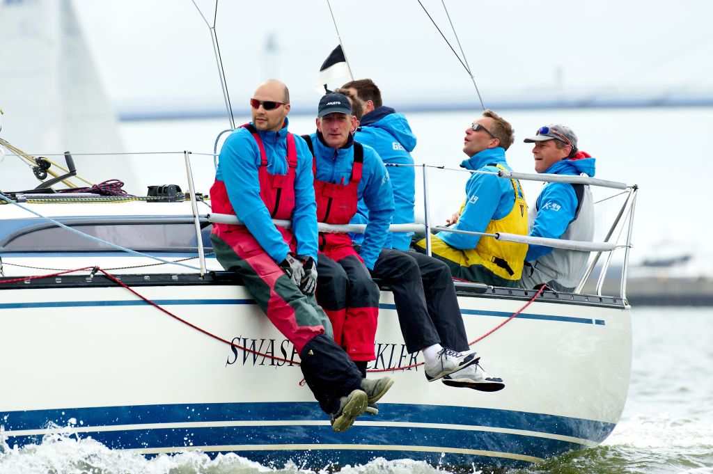 Sonnabend früh um 09:05 Uhr werden wir dann in Yardstickklasse 1 mit dem letzten Start auf den Weg um die Insel geschickt, dieses Jahr links herum. Mit dabei sind auch in diesem Jahr mit Matchbox und Drei auf X zwei Schwesterschiffe. Nach einer kurzen Startkreuz kommen wir (Heiko und Gunthi an der Pinne, Micha, Stefan, Rolf und Ralf) als zweites Schiff kurz nach der Melges 24 Laika an der Luvtonne an. Ab hier geht es bei Sonne und 3-4 Windstärken mit Halbwind zwischen Rügen und Hiddensee hoch nach Norden.
