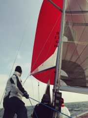 Unser neues Sportgerät ist getauft – sie segelt jetzt als Wildcard. Wir haben auch schon ein erstes kurzes Training absolviert, das allerdings bei 20 Knoten Wind und mehr nicht soo viele Manöver beinhaltete 🙂