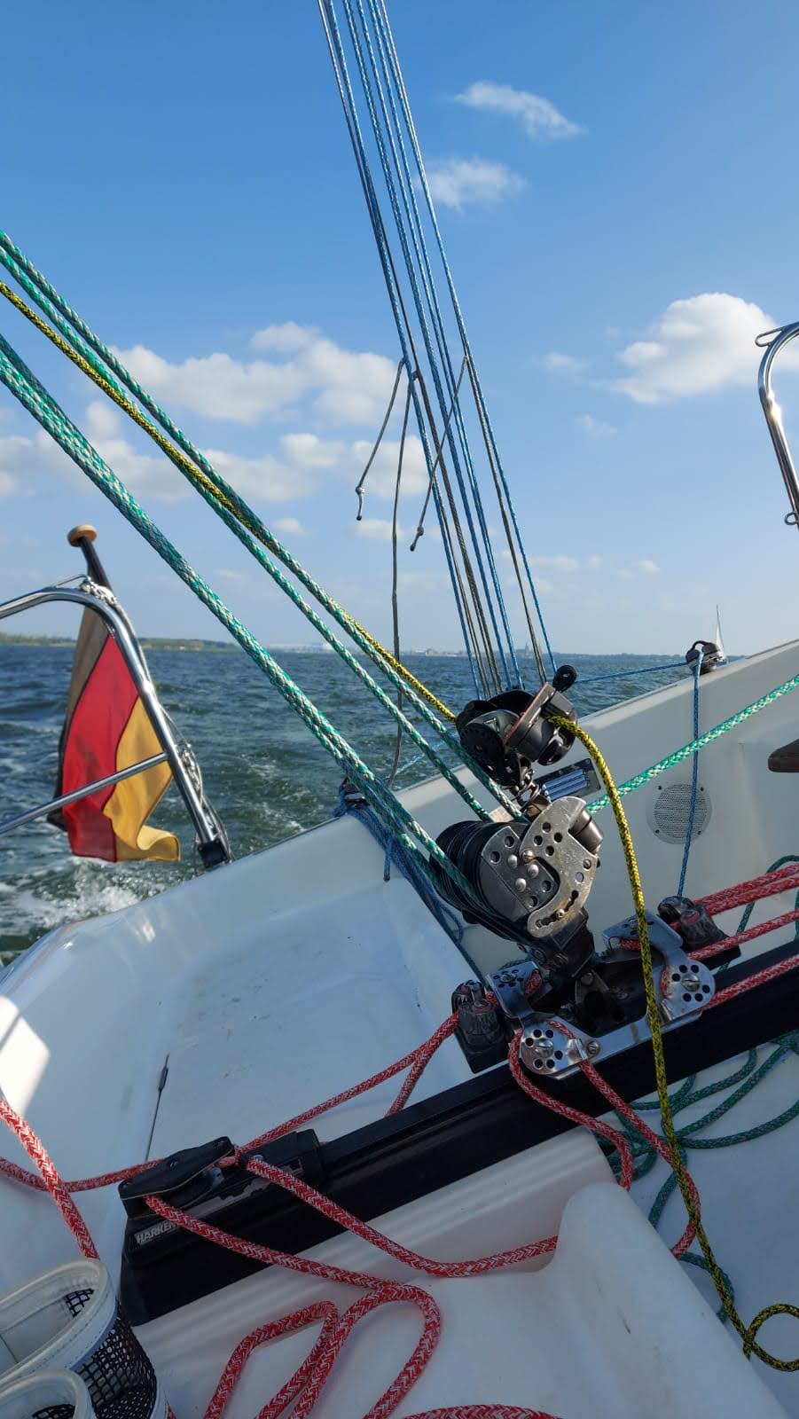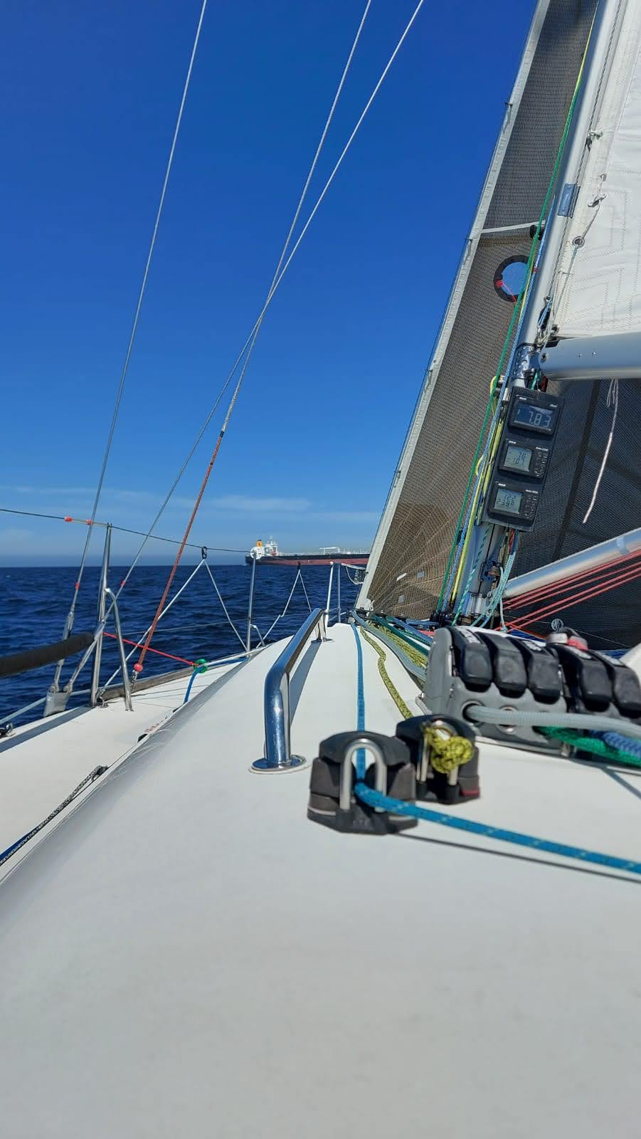 Unser Start ist auf Donnerstag, 11:40 Uhr angesetzt. Es wird ein Vorwindstart, mit Schiebestrom von hinten. Heiko an der Pinne bekommt das mal wieder hervorragend hin, und wir sind unterwegs. Direkt neben uns startet das neue Flaggschiff von X-Yachts, eine riesige X 5.6 – schon beeindruckend, wenn auch nicht soo viel schneller 😊