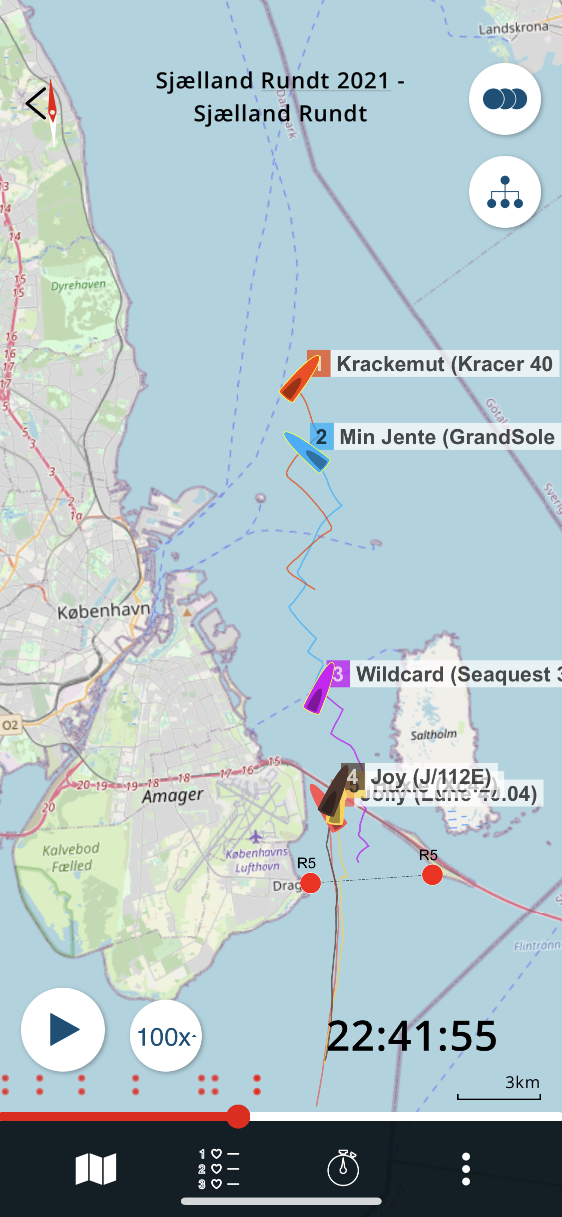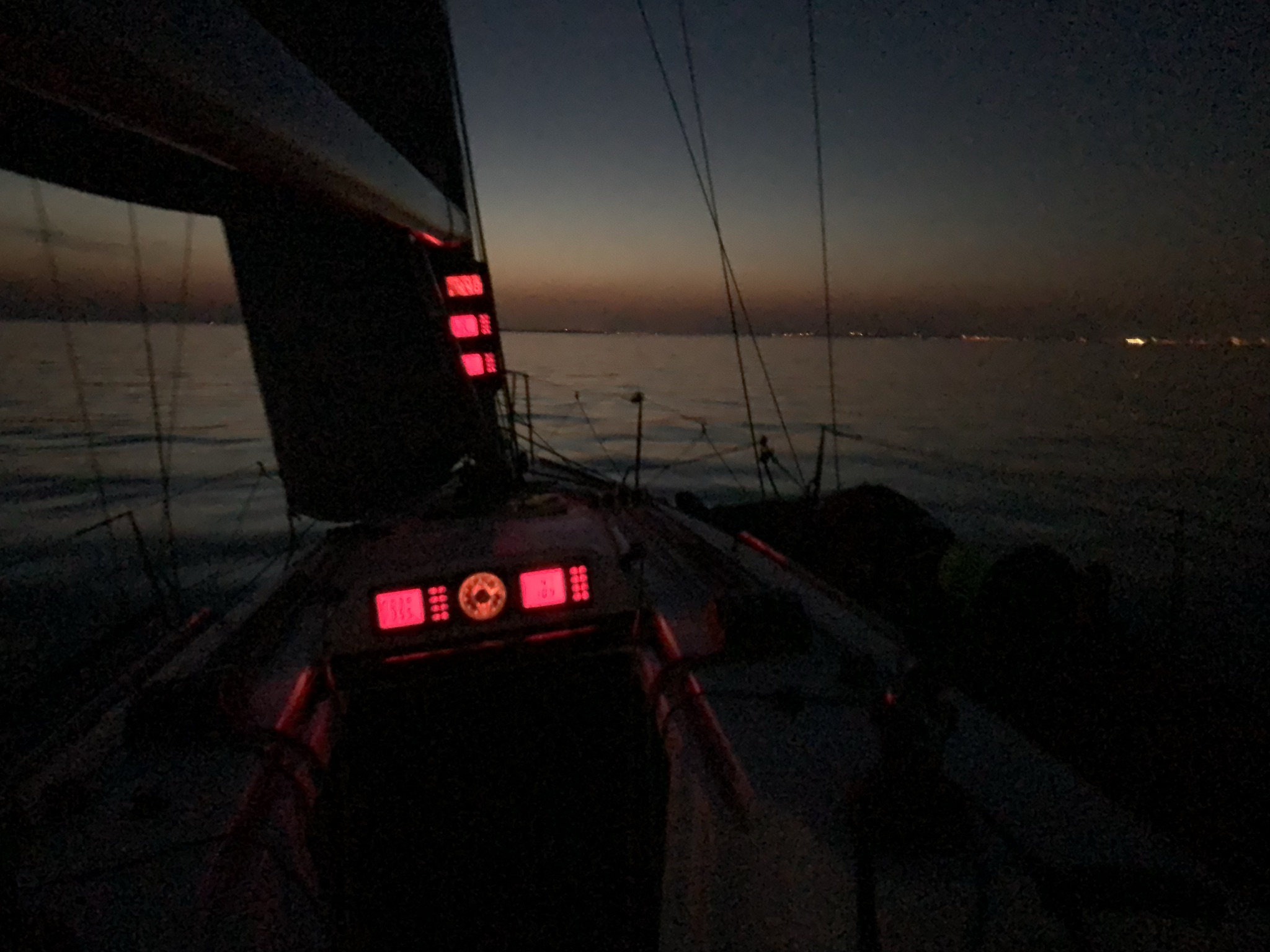 Am Eingang zum Grønsund, der Brücke bei Farø, können wir die J/112E gegen 08:30 am Freitag morgen zunächst wieder abschütteln, es bleibt aber eine Kreuz durch den gesamten Grønsund. An dessen Ausgang wartet die erste Flaute auf uns – hier trifft sich die gesamte Gruppe wieder, es ist quasi ein Neustart. Das geht so bis Freitag mittag, und wir kämpfen uns quälend langsam kreuzend in Richtung der Kreidefelsen von Møn. Dort kommen wir erst am Nachmittag gegen 16:00 Uhr an, wieder an zweiter Stelle hinter Krackemut liegend. Direkt hinter den Kreidefelsen lauert schon die nächste Flaute, gefühlt dauert es ewig, bis wir wieder in Gang kommen und Wildcard sich Richtung Øresund bewegt. Der Wind legt aber wieder zu und raumt etwas, so dass wir mit dem Code und ca. 8 Knoten Speed Richtung Dragør laufen. Wir sehen aber schon auf dem Tracker, dass die Boote vor uns dort wieder zu kreuzen beginnen. Die Windvohersage, die für die zweite Nacht stabile 12 Knoten Südost vorhergesagt hatte, liegt völlig daneben, wir haben nur etwa 4-6 Knoten Wind aus Nord, teils sogar weniger. Also verbringen wir die zweite Nacht damit, den gesamten Øresund bis zur Insel Hven in Schleichfahrt aufzukreuzen. Dabei haben wir auch noch extremen Windshear – der Windex und die Windinstrumente zeigen auf Backbordbug einen AWA von nahezu 0 Grad an, während es auf Steuerbord ca. 60 Grad sind, der Wind kommt also im Masttop aus einer ganz anderen Richtung als weiter unten.